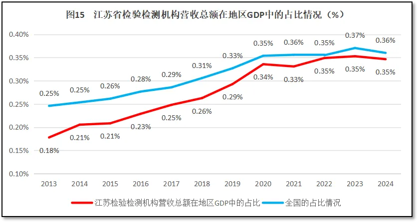再来看江苏省检验检测机构营收总额在其地区生产总值GDP中的占比情况。2024年度,江苏省检验检测机构营收总额474.63亿元,占当年江苏省GDP值的0.35%,略低于全国平均值0.36%,排名全国第14(按照由高到低排序,排名较2023年度下降2位)。过去12年江苏省检验检测机构营收总额在当地GDP值的比例变化情况如图15所示。