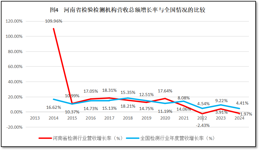 比较河南省检验检测行业年度营收总额增长率与全国检验检测行业年度营收总额增长率随时间的变化,如图4所示。